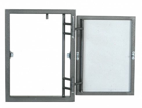 Włazy niewidoczne uchylne wykonane są z profilowanej rury stalowej (przekrój rury dla ościeżnicy – 40×20 mm, dla drzwi – 15×15 mm). Do drzwi przymocowana jest płyta z odpornej na wilgoć blachy gipsowej. Jako akcesoria stosowane są zamki rolkowe produkcji europejskiej. Metalowe elementy konstrukcji łączone są za pomocą spawania łukowego argonem cienkimi szwami i pokrywane antykorozyjną warstwą farby. Ten sposób montażu i obróbki jest najbardziej niezawodny, gwarantując długotrwałe działanie produktu.